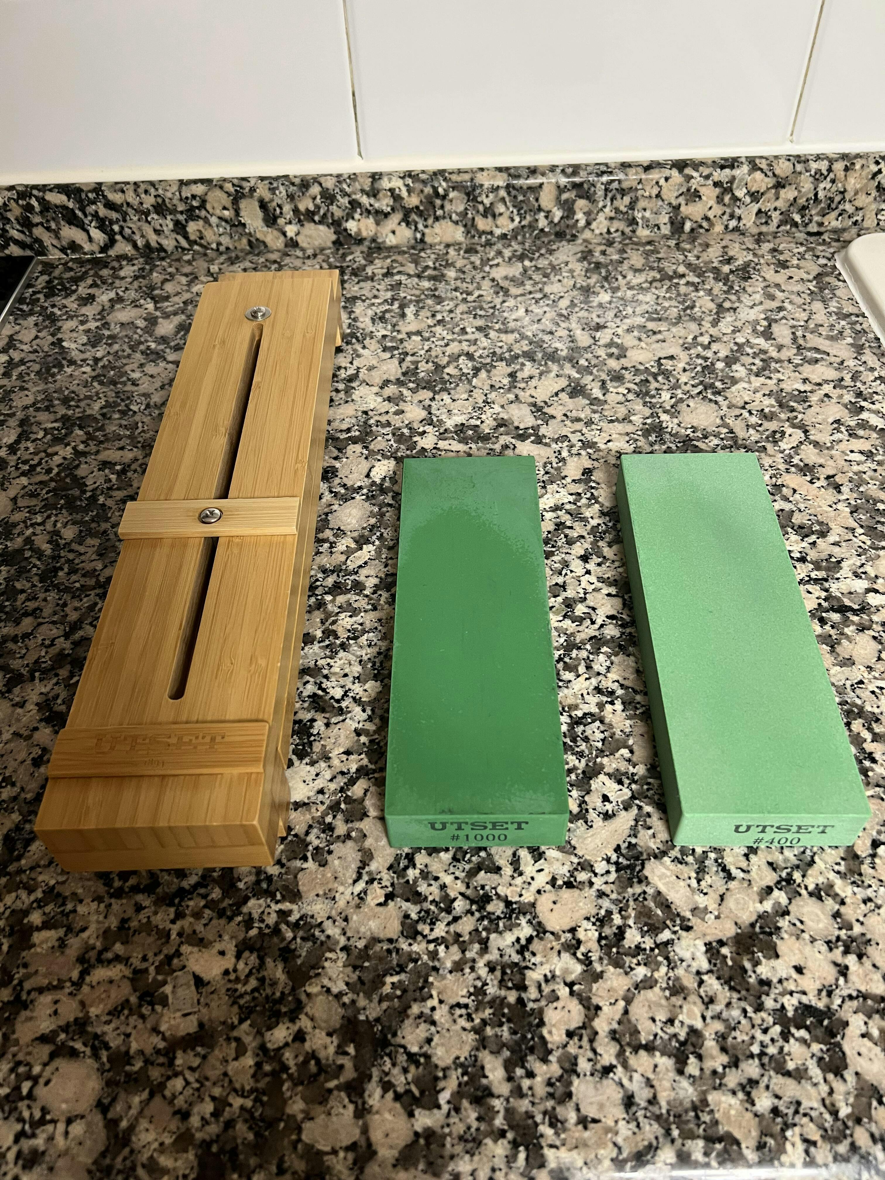 Soporte "puente" fabricado en madera de bambú para sujetar las piedras de afilado.